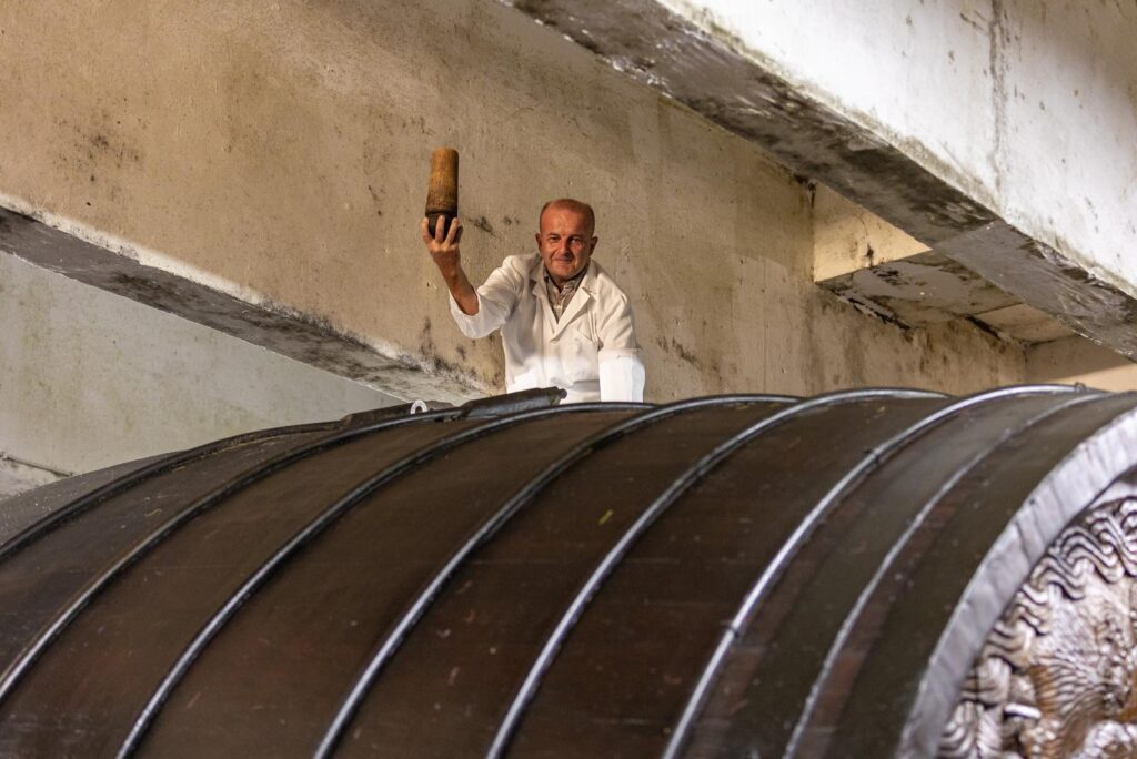 It is made of thick, solid Slavonian oak, and there’s a pool of the same volume underneath it in case it ever starts leaking under the pressure. Much like any other, this wooden barrel likes to indulge in a little of the wine itself. This one consumes as much as 750 litres of wine a year!