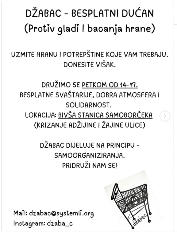 Džabac came to life last year, more specifically February, on the wave of boycotts of retail chains taking place back at the time. There’s no individual person, association or formal organisation behind its establishment. Džabac, they say, was created thanks to individuals who believe in what it represents. Its point was to bring together those who want and can help and to let people know that there’s a location where this idea is being implemented. “The point is for people to get involved and help themselves while helping others,” they say.