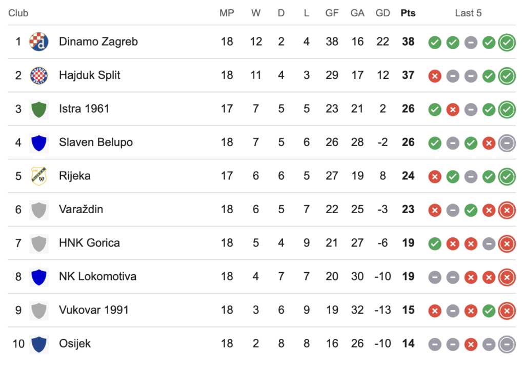After 18 rounds, the 2025/26 season reaches its halfway stage with Dinamo crowned winter champions. The Zagreb side head into the break with 38 points and a goal difference of +22. Hajduk, however, remains in close pursuit, just one point behind with 37 and a goal difference of +12, promising a thrilling title race in the spring.